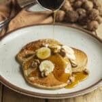 - Pour scant ¼ cups of the batter onto a preheated griddle or cast iron pan on medium heat. If you want, you can lay a few ¼ inch slices of banana on top of each pancake or a sprinkle of lightly toasted walnuts.