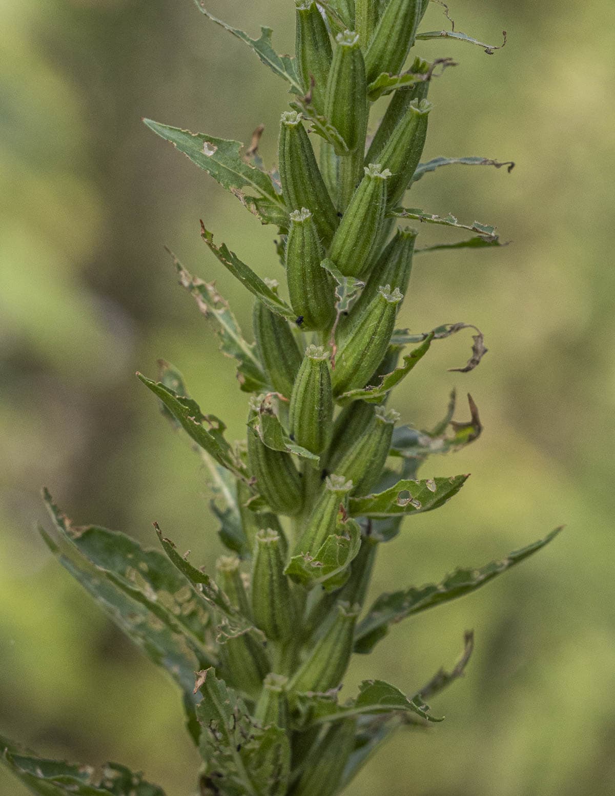 Many green, alternating seed pods are borne on the stalk. These are what you'll want to harvest in the fall if you want to try the seeds, which are plentiful and easy to harvest. In fact, the plants are actually cultivated for their seeds, which are pressed for evening primrose oil, which is marketed as a women's health supplement.