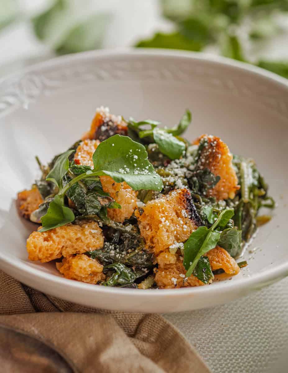 Cheap bread is light and airy, and even toasted until very dry it will quickly turn slippery, soft and mushy when cooked. Ideally, just as with ribollita and pappa al pomodoro (similar related recipes) I like the bread to hold its shape and be tender. The chunks of bread should be like soft dumplings that barely hold together.